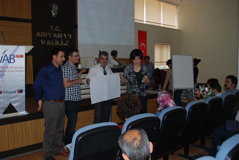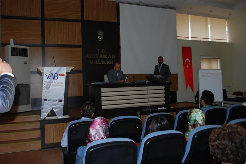 Avrupa Birliği Bakanlığı tarafından uygulanmakta olan Valiliklerde AB İşleri için kapasite oluşturulması (VABpro) projesi Kapasite Geliştirilme Faaliyetleri kapsamında kamu kurum ve STK temsilcilerine 12-13 Mayıs tarihinde Adıyaman Valiliği toplantı salonunda AB bakanlığı tarafından görevlendirilen bir uzman tarafından proje yazma eğitimi verildi.