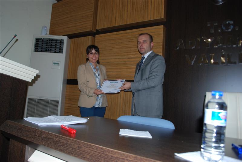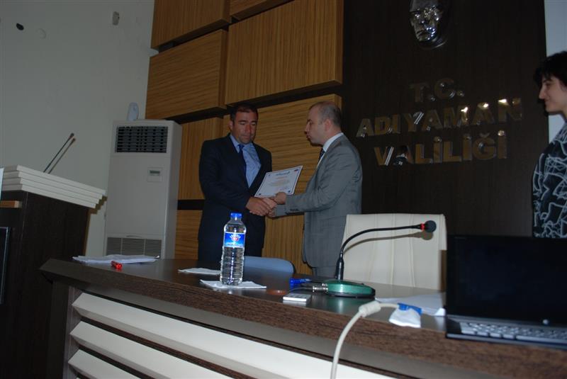 Adıyaman Valiliği Projeler Koordinasyon Merkezi tarafından organize edilen proje yazma eğitimine katılan ilimiz kamu kurumu ve STK temsilcilerine eğitim sonunda düzenlenen törenle Vali Yardımcısı Murat SÜZEN tarafından katılım belgeleri verildi.