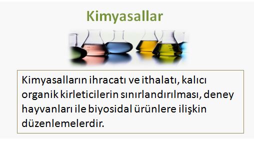 Kimyasalların ihracatı ve ithalatı, kalıcı organik kirleticilerin sınırlandırılması, deney hayvanları ile biyosidal ürünlere ilişkin düzenlemelerdir.