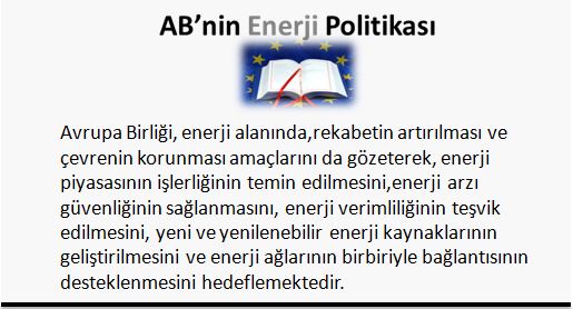 Avrupa Birliği, enerji alanında,rekabetin artırılması ve çevrenin korunması amaçlarını da gözeterek, enerji piyasasının işlerliğinin temin edilmesini,enerji arzı güvenliğinin sağlanmasını, enerji verimliliğinin teşvik edilmesini, yeni ve yenilenebilir enerji kaynaklarının geliştirilmesini ve enerji ağlarının birbiriyle bağlantısının desteklenmesini hedeflemektedir.