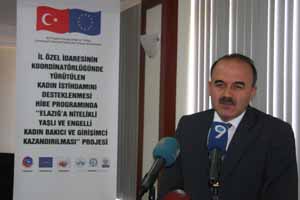 Düzey II bölgelerinde, yerel ihtiyaçlara uygun olarak kadınların işgücü piyasasına katılımına mani olan sosyal kültürel engelleri azaltmayı, istihdama erişmelerini desteklemeyi, eğitim vermek yolu ile istihdam edilebilirliliğini arttırmayı ve kadın girişimciliğini desteklemeyi hedefleyen "Kadın İstihdamının Desteklenmesi Hibe Programı" kapsamında hibe almaya hak kazanan "Elazığ'a Nitelikli Yaşlı ve Engelli Kadın Bakıcı ve Girişimci Kazandırılması" projesinin açılış toplantısı 24.08.2010 tarihinde İl Özel İdaresi toplantı salonunda yapılmıştır. Proje sahibi olarak açılış toplantısına ev sahipliği yapan İl Özel İdaresi Genel Sekreterliği yanında Elazığ Valisi Muammer EROL, Ticaret Odası Başkanı Ali ŞEKERDAĞ, Türkiye Sakatlar Derneği Elazığ Şubesi, Elzerem Vakfı, Elazığ Halk Eğitim Merkezi ve Akşam Sanat Okulu, Mamüret'ül-Aziz Yardımlaşma ve Dayanışma Vakfı Öğretmen Sıdıka Avar Kız ve Meslek Lisesi, Fırat Üniversitesi ve Milli Eğitim Müdürlüğü'ne bağlı kurumların yetkili temsilcileri katılmışlardır.